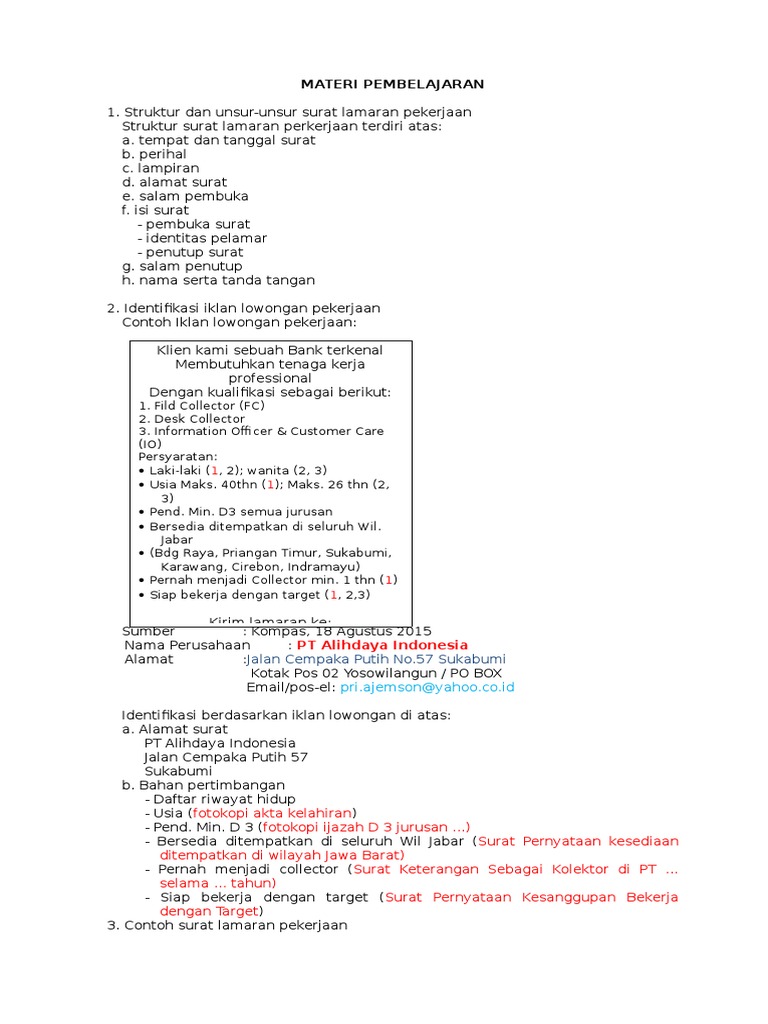 Perlu diketahui bahwa dalam penulisan contoh surat lamaran kerja yang ditulis menggunakan tangan biasanya tidak terdapat kop surat atau kepala surat. Yang menyangkut dengan arti,unsur dan contoh surat lamaran pekerjaan sebagai berikut. Demikian surat lamaran pekerjaan ini saya buat. Bahasa pada bagian isi surat juga menggunakan kata pengantar yang singkat, padat, jelas, dan formal. Saya harap, bapak/ibu dapat mempertimbangkannya dan memberi kesempatan agar saya. Peserta didik diminta untuk membandingkan unsur kebahasaan surat lamaran pekerjaan. Surat lamaran pekerjaan biasanya berbentuk sebagai surat pengantar atas berbagai lampiran lain sehingga menjadi satu berkas lamaran kerja. Surat lamaran pekerjaan bisa juga diartikan dengan suatu surat dari calon karyawan kepada calon majikan yang berisi permintaan supaya karyawan diberi pekerjaan oleh calon majikan.